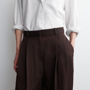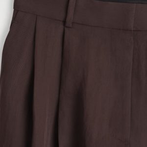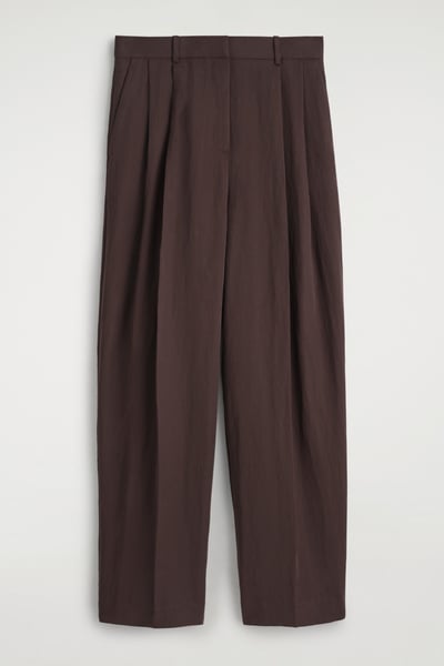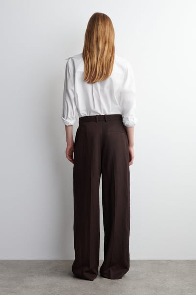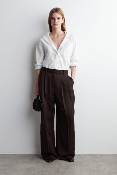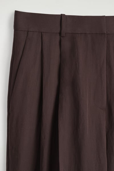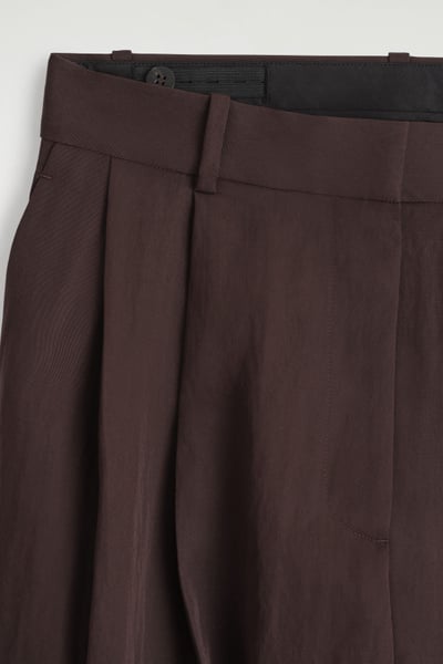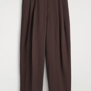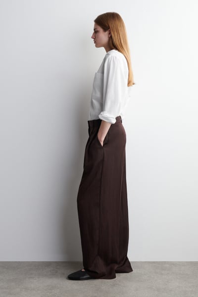 These pants are a cornerstone of the COS womenswear collection. Crafted from a fluid TENCEL™ Lyocell blend, they’re tailored in a relaxed shape with sharp front pleats and loose, wide legs. Experiment with the fit using the adjustable tab inside the waistband.
