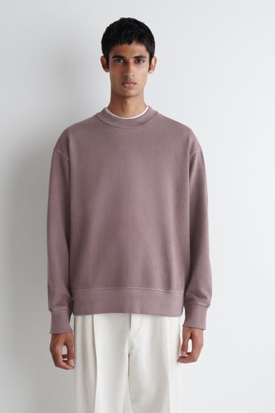 Considered leisurewear is a foundation of the casual wardrobe. Faded to a washed-burgundy hue, this sweatshirt is crafted from recycled cotton jersey with a soft hand feel and features a mock neck and ribbed trims. Wear it on casual weekends with chinos or denim.