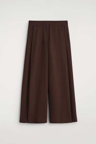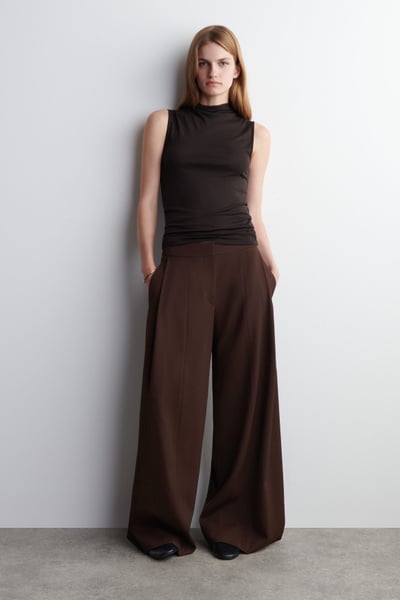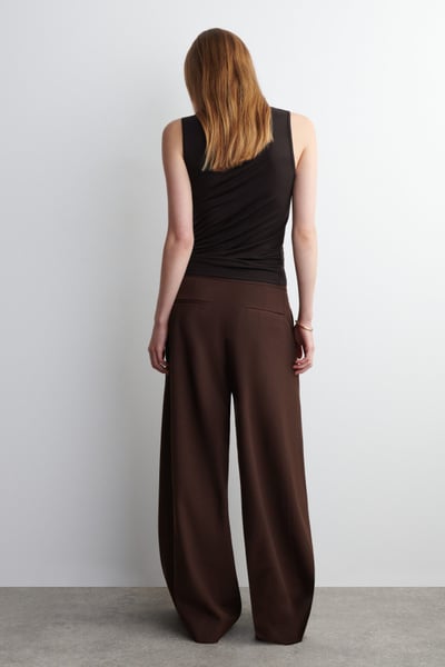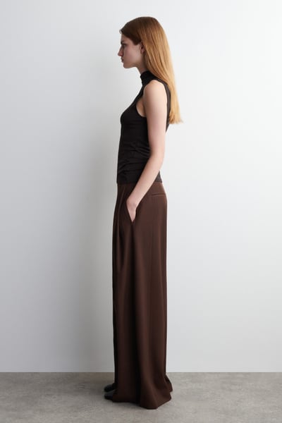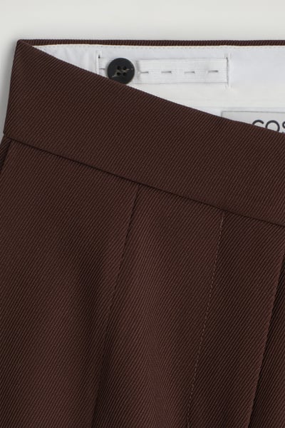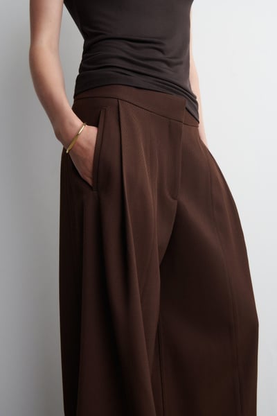 Rendered in a rich espresso hue, these pants are crafted from wool-blend twill and cut with pleated, wide legs that break at the shoes. The welt pockets nod to suiting codes, while the clean waistband adjusts to create a bespoke fit.