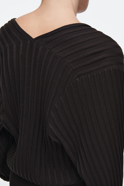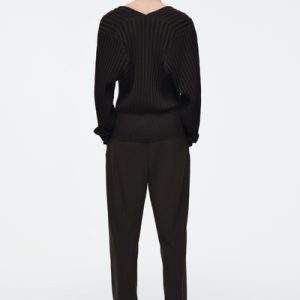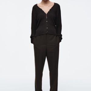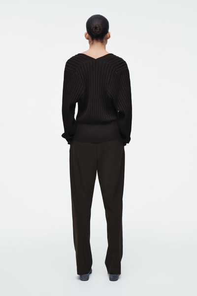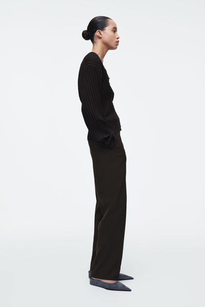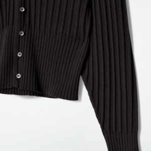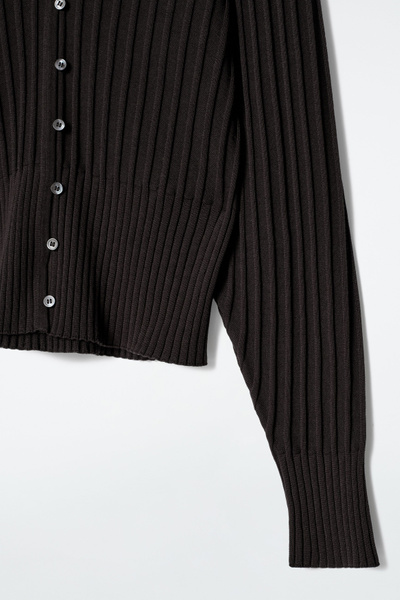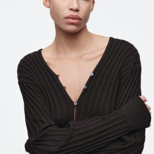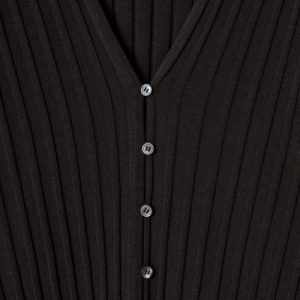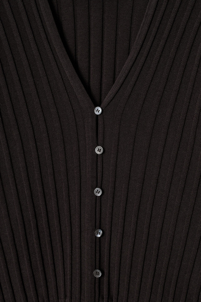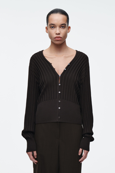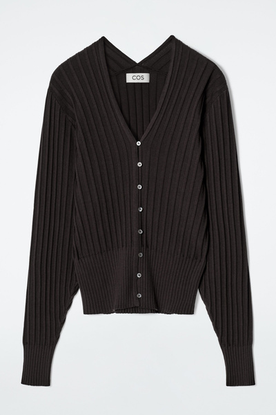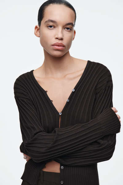 The COS SS25 runway collection builds on the house codes of lasting design and exceptional craftsmanship. Offered in a rich chocolate tone, this V-neck cardigan is made from a blend of premium mulberry silk and soft cotton that’s ribbed for a tactile finish. It’s cut in a slim silhouette that creates a cocooning shape at the back and closes with a row of mother-of-pearl buttons.Style it as a coord with thematching micro shorts.
