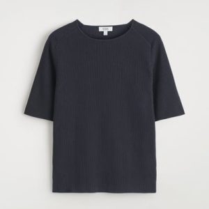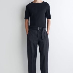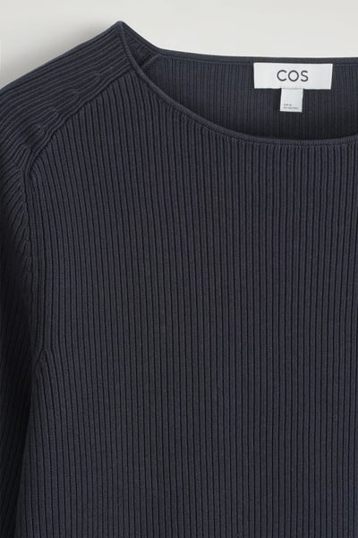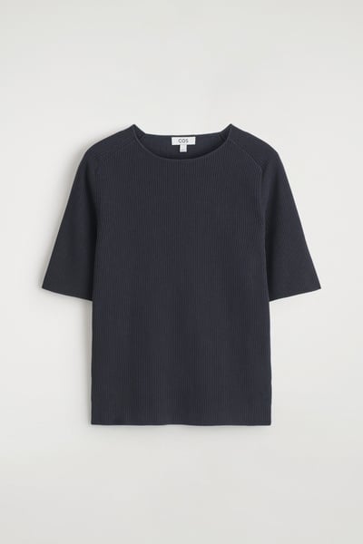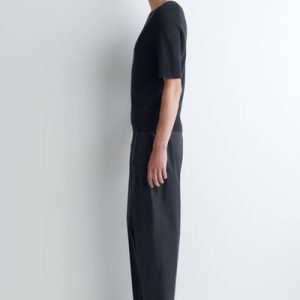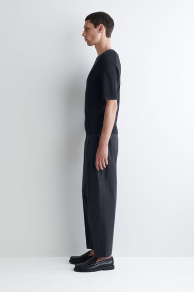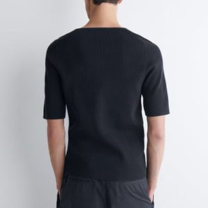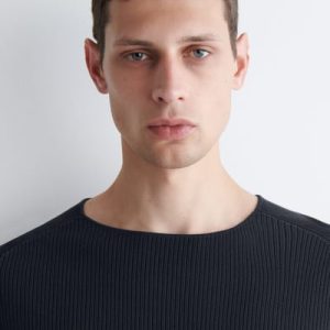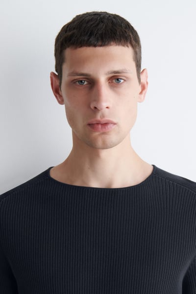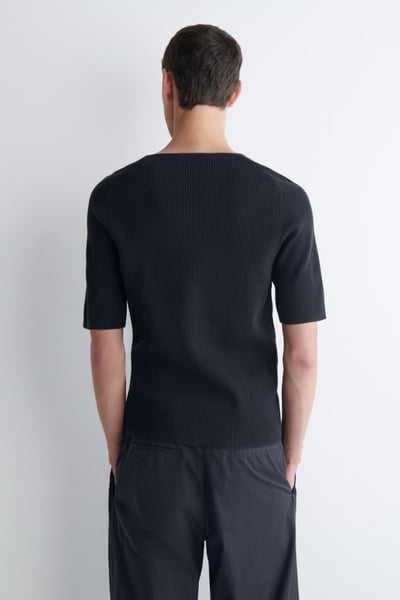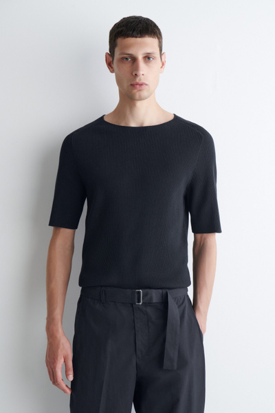 The menswear team subtly reimagines the classic T-shirt. This ribbed piece is crafted from soft cotton and designed with a boat neckline and short sleeves. Style it with tailoring or denim.