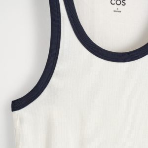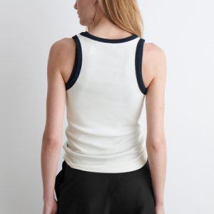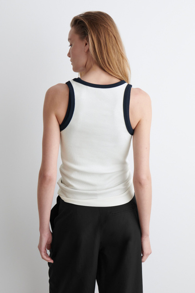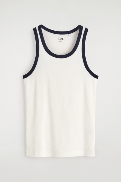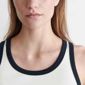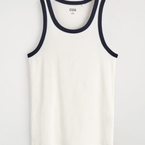 Made from ribbed organic cotton jersey with a touch of stretch, this slim-fit tank top is an essential on warmer days. It’s offered in a classic white hue with contrasting trims and has endless styling opportunities – wear it alone or layered under shirts and blazers.