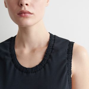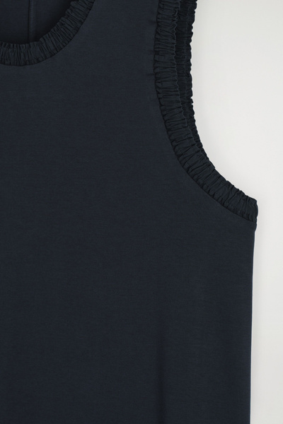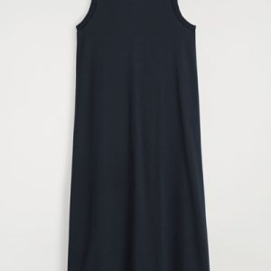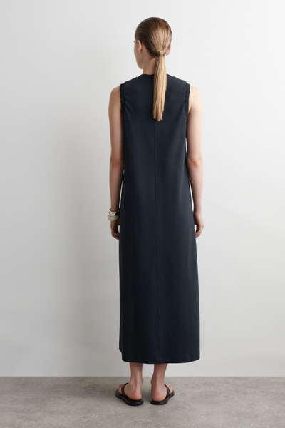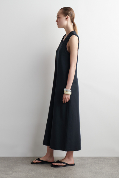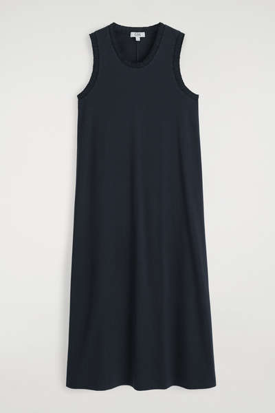 For Spring Summer 2025, the classic midi dress is softened by flowing shapes and considered finishing touches. This piece is crafted from soft cotton-jersey with hints of stretch and designed with a curved neckline, subtle slip pockets, and an A-line hem. It’s bordered with ruffled trims for subtle contrast.