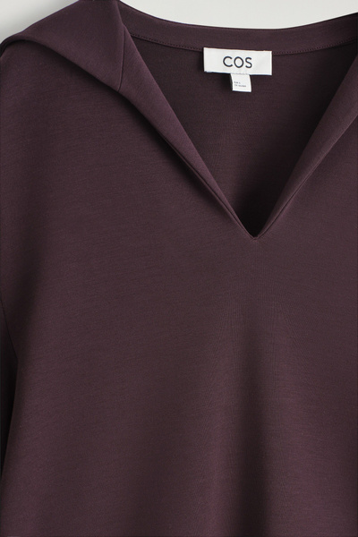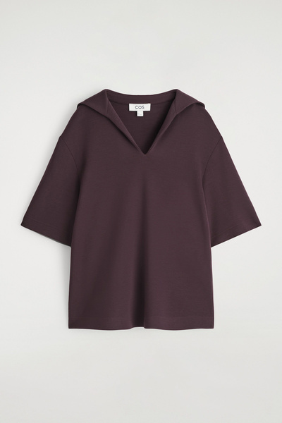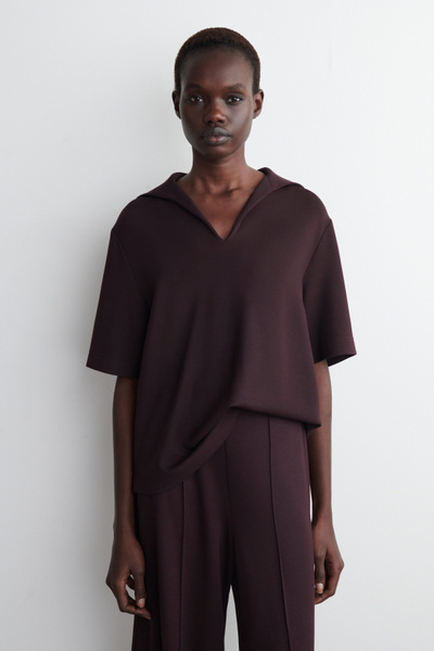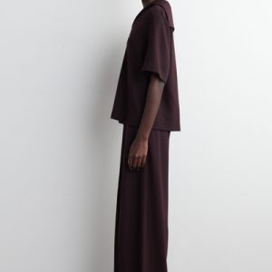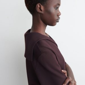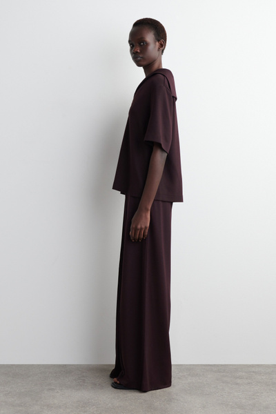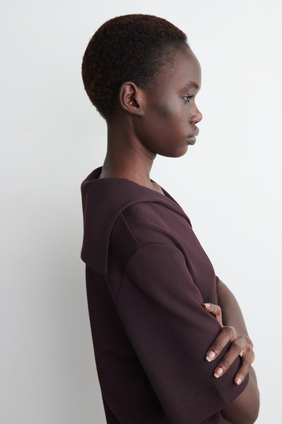 This burgundy T-shirt proposes a modern take on ’60s silhouettes. Crafted from lightweight modal jersey, it’s designed with a sailor collar that spreads across the shoulders and has an effortlessly draped shape.