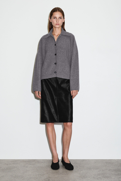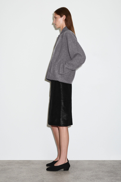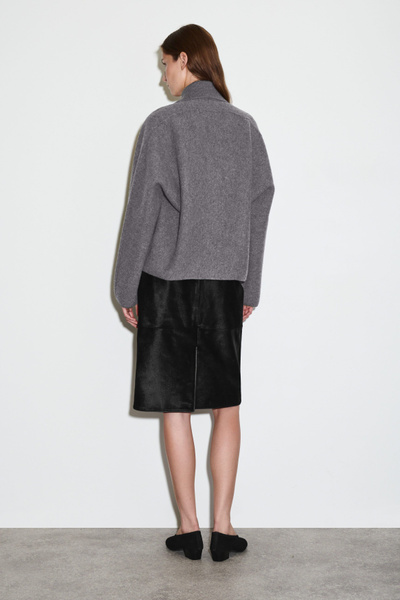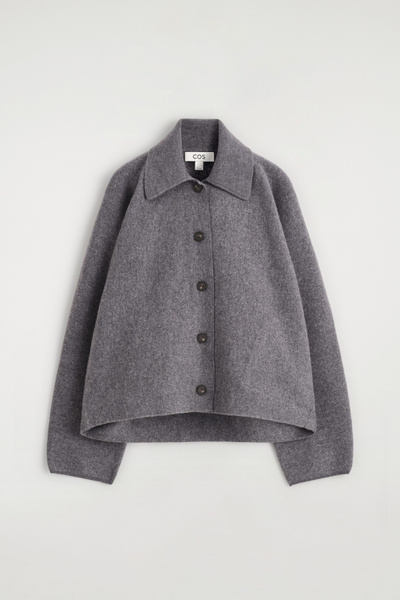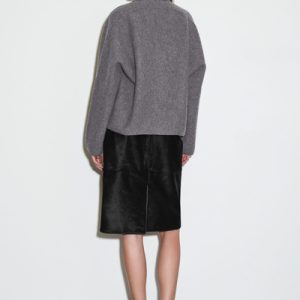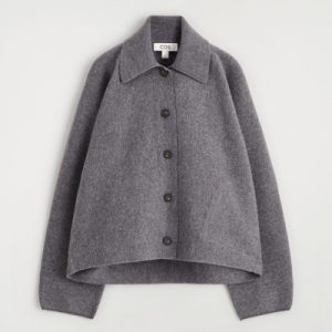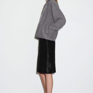This modern jacket is designed to ease your wardrobe into the fall/winter months. Offered in timeless gray mélange, this piece is crafted from boiled merino wool that’s light enough for the transitional seasons and designed in a softly sculpted shape. It has a ribbed collar and discreet side pockets.