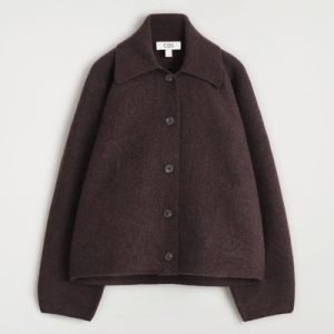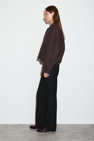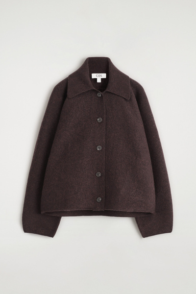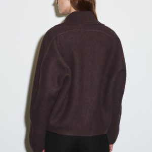 This modern jacket is designed to ease your wardrobe into the fall/winter months. Offered in a rich espresso tone, this piece is crafted from boiled merino wool that’s light enough for the transitional seasons and designed in a softly sculpted shape. It has a ribbed collar and discreet side pockets.