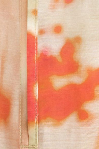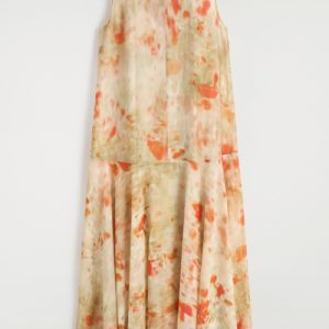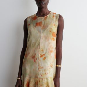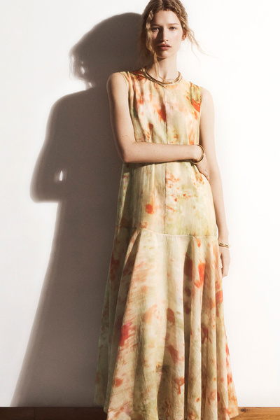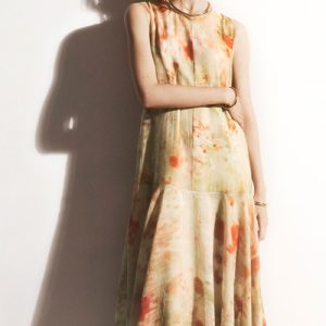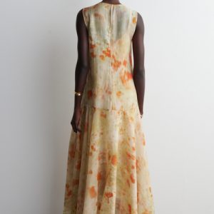 This sheer maxi dress offers a modern take on transparency. It’s designed with a dropped waistline that’s circle-cut for volume, while the internal mini slip dress provides extra coverage and adjusts at the straps for a perfect fit. Created in-house, the blurred watercolor motif evokes a meadow in bloom.