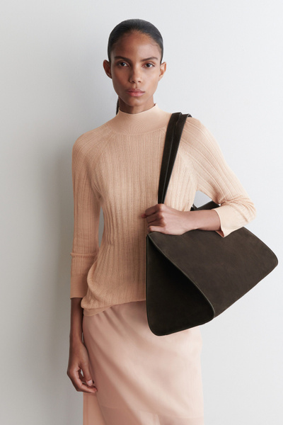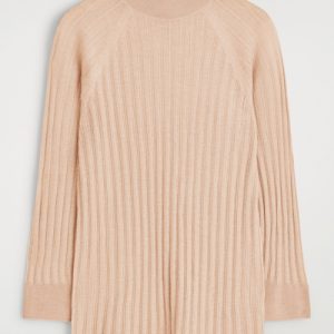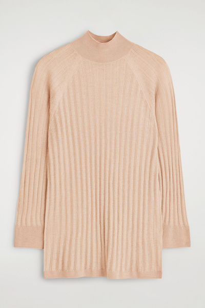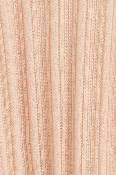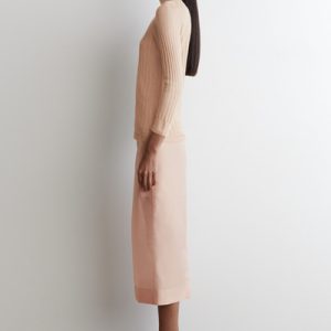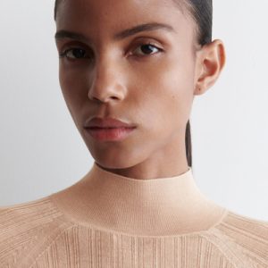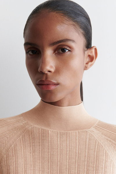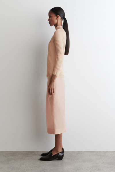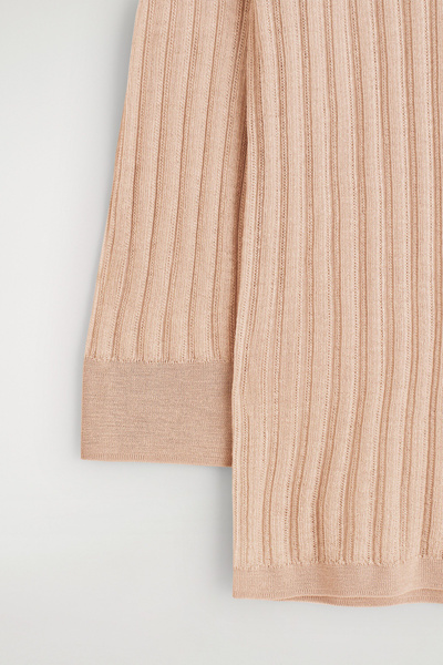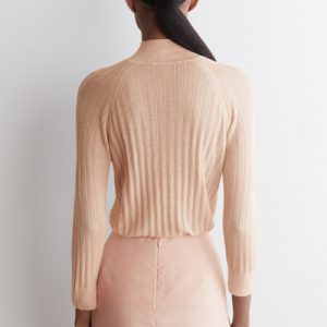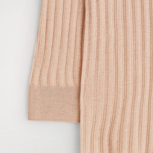 Classic knitwear codes are redefined for Pre-Fall 2025. Rendered in a subdued peach tone, this piece is finely rib-knitted from premium mulberry silk and merino wool with a semi-sheer finish and is cut in a slim silhouette with slightly cropped sleeves.