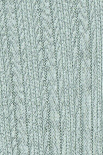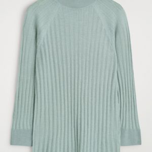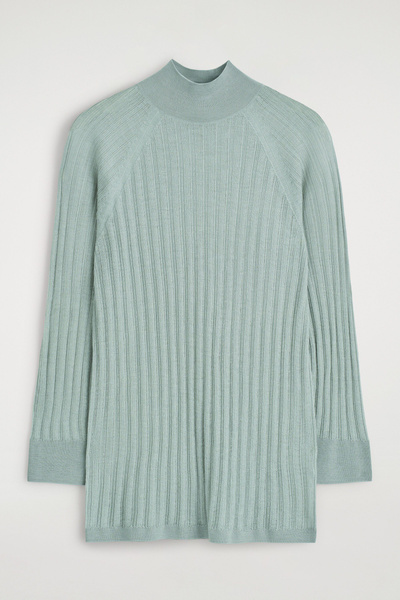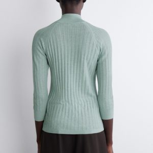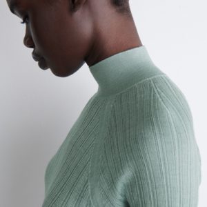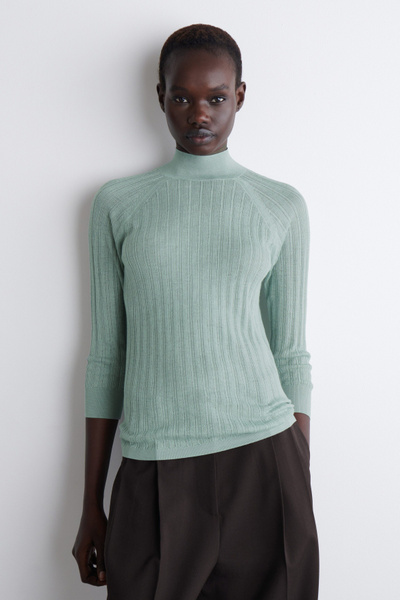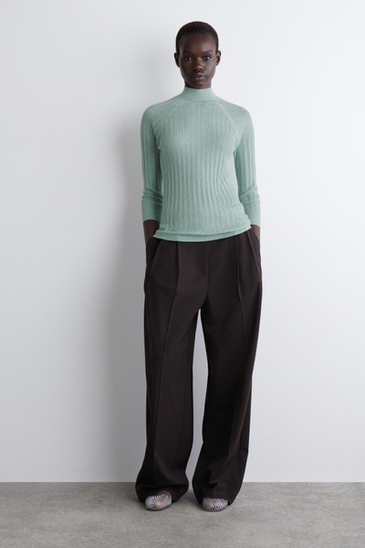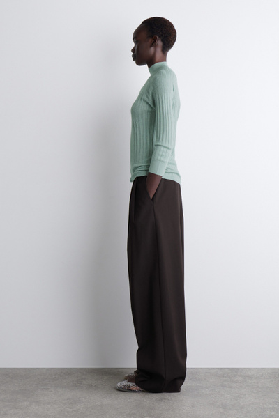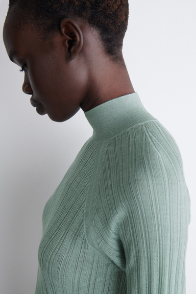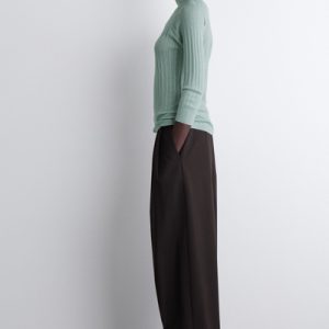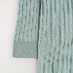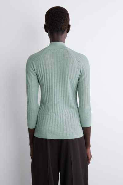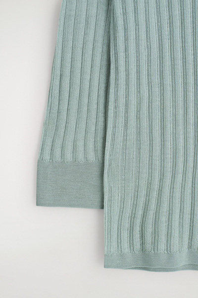 Classic knitwear codes are redefined for Pre-Fall 2025. Rendered in a subdued turquoise tone, this piece is finely rib-knitted from premium mulberry silk and merino wool with a semi-sheer finish and is cut in a slim silhouette with slightly cropped sleeves.
