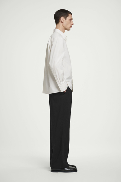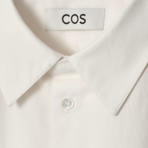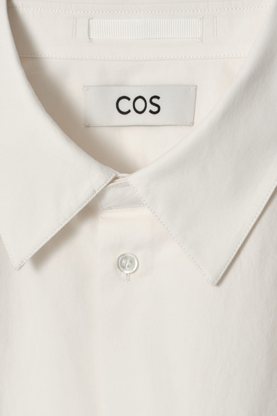The COS SS25 runway collection builds on the house codes of lasting design and exceptional craftsmanship. An expertly tailored shirt is the hallmark of a well-curated wardrobe; this white one is made from Materra® cotton-poplin chosen for its crisp yet soft handle. It’s cut in a classic shape with a straight hem, mother-of-pearl buttons and a grosgrain hanger loop at the nape – a signature of the capsule.
