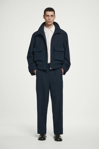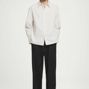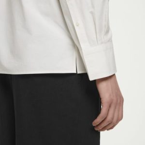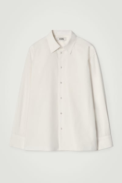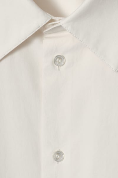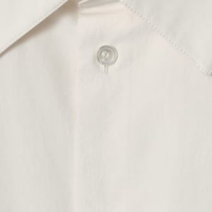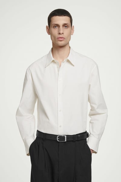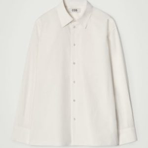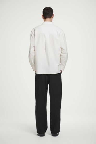 The COS SS25 runway collection builds on the house codes of lasting design and exceptional craftsmanship. An expertly tailored shirt is the hallmark of a well-curated wardrobe; this white one is made from Materra® cotton-poplin chosen for its crisp yet soft handle. It’s cut in a classic shape with a straight hem, mother-of-pearl buttons and a grosgrain hanger loop at the nape – a signature of the capsule.