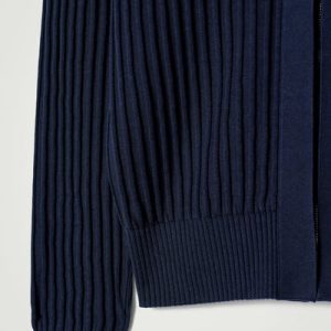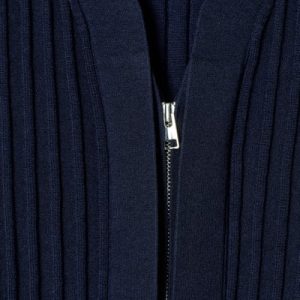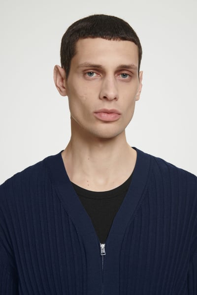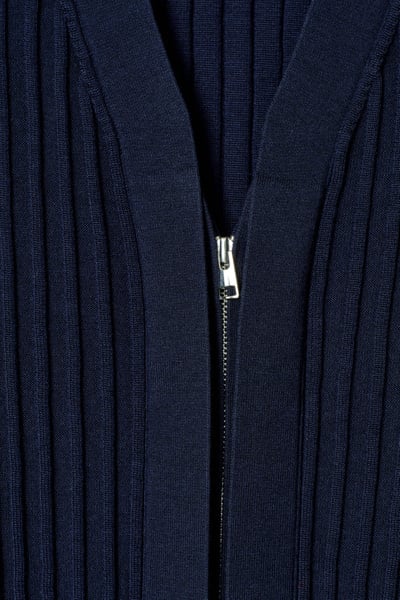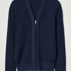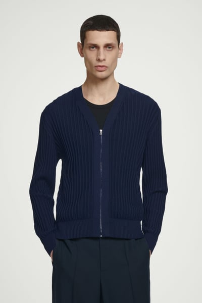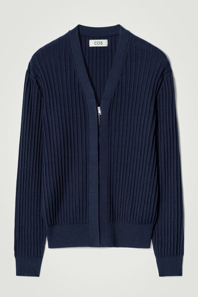 The COS SS25 runway collection builds on the house codes of lasting design and exceptional craftsmanship. Rendered in a rich midnight-navy tone, this polished cardigan is made from a blend of lustrous mulberry silk and soft cotton that’s ribbed for a tactile finish. It’s cut in a classic shape and features a high V-neckline and concealed silver-tone zip.