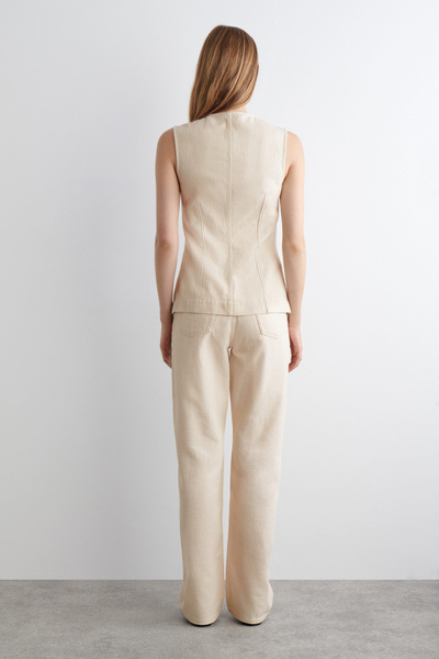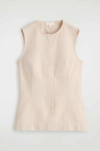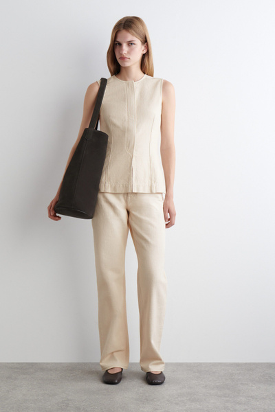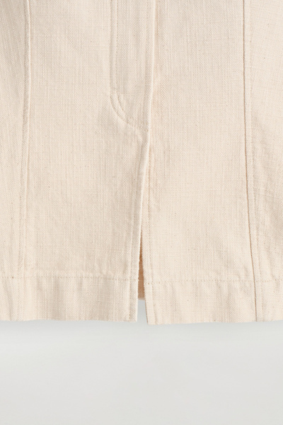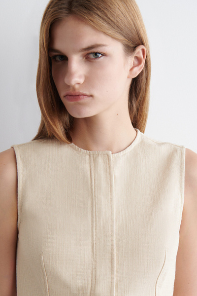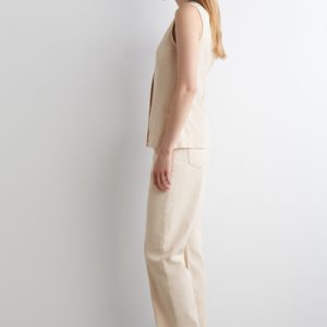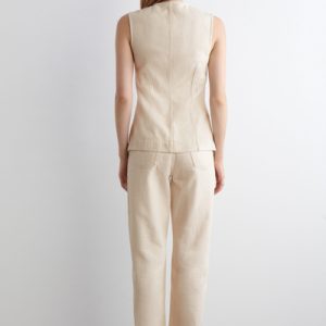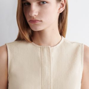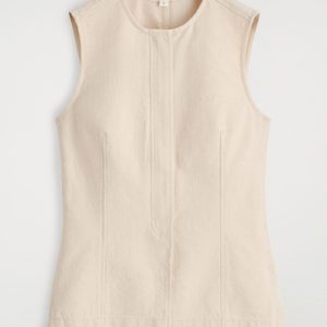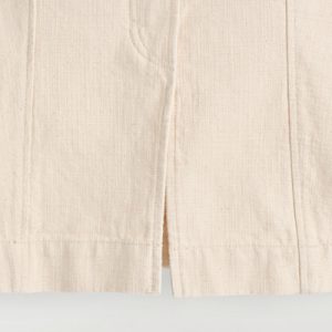 Classic denim silhouettes have been reimagined for the upcoming season. This modern top is cut in a slim shape with contouring waist darts and is made from organic and recycled cotton that’s lightened to an off-white hue.
