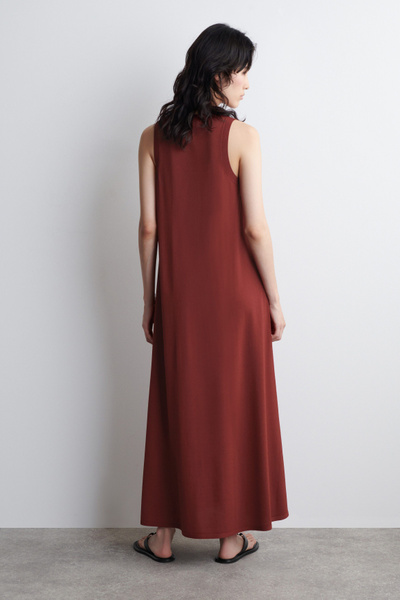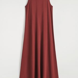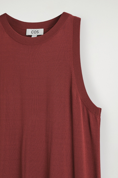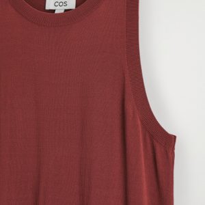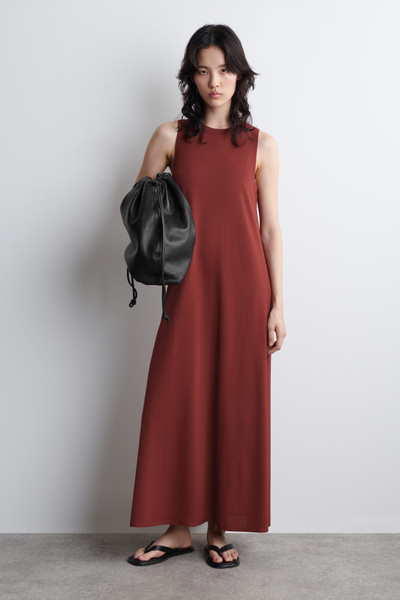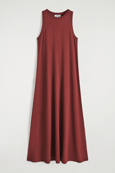 The COS dress collection spotlights versatile pieces in impactful silhouettes. This knitted piece is offered in a saturated red tone and designed with a ribbed neckline and flowing maxi skirt. Style it with minimal sandals for a considered look.