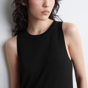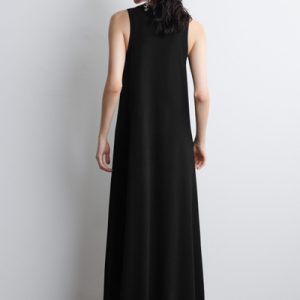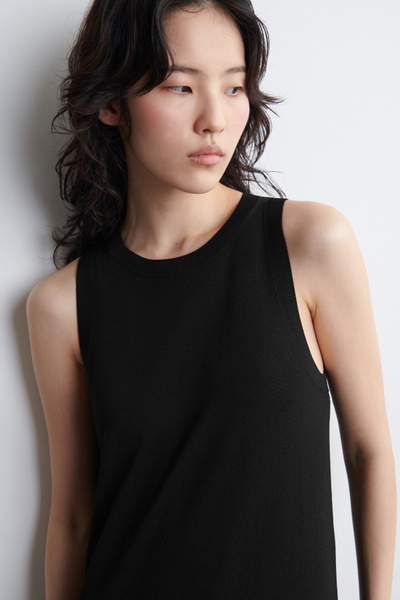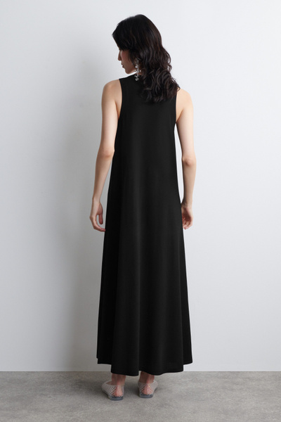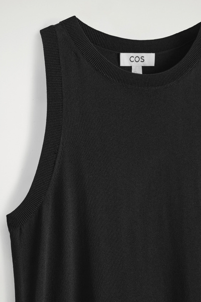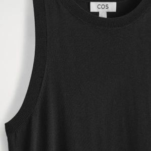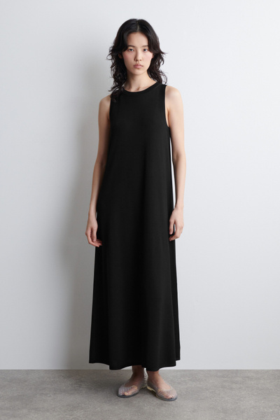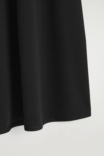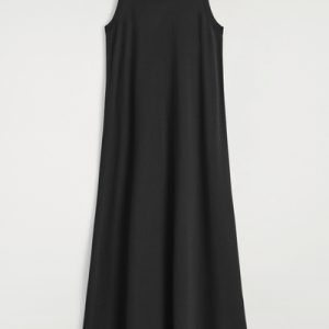 The COS dress collection spotlights versatile pieces in impactful silhouettes. This knitted piece is offered in an enduring black tone and designed with a ribbed neckline and flowing maxi skirt. Style it with minimal sandals for a considered look.