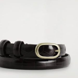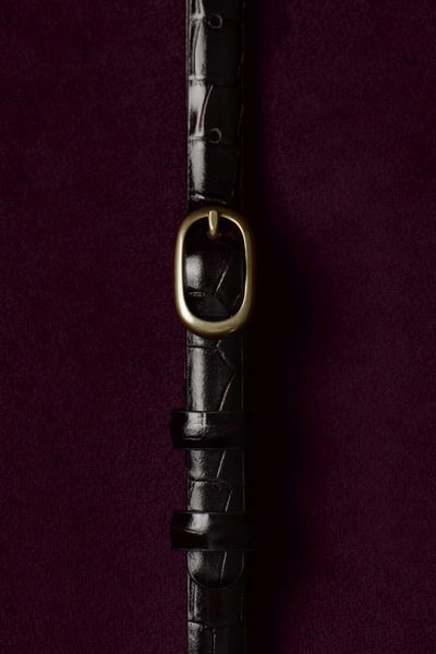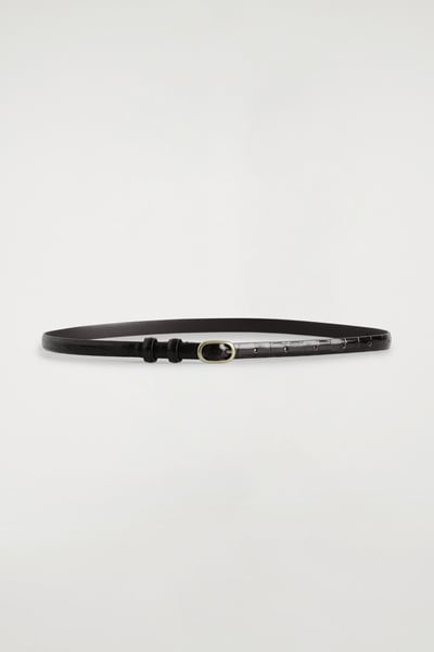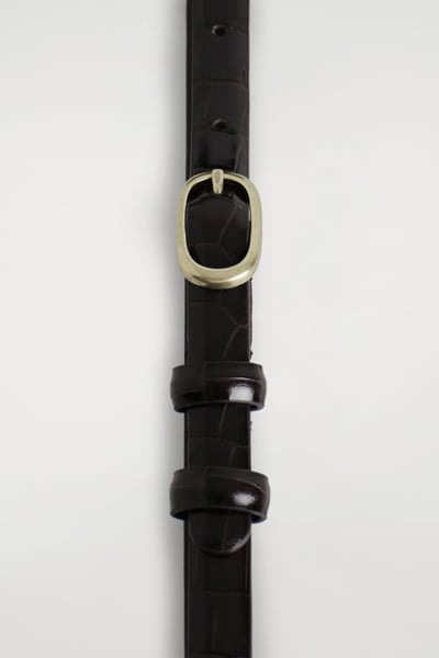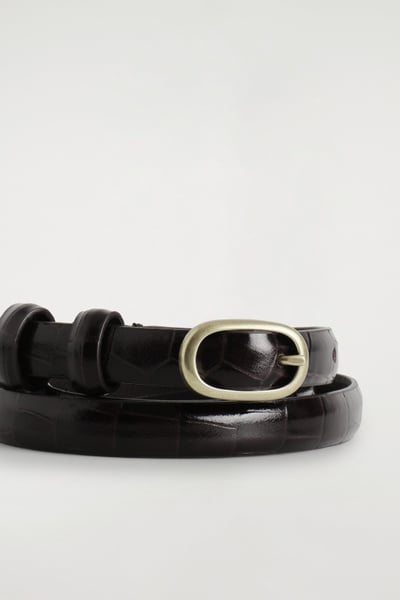 This refined belt is crafted from supple chrome-free leather and embossed with a textural crocodile-effect pattern. It’s designed in a slim silhouette and closes with a sculptural gold-tone oval buckle. Style it with tailoring or denim.