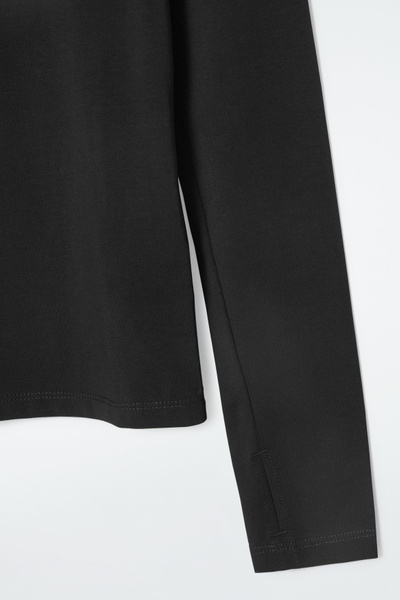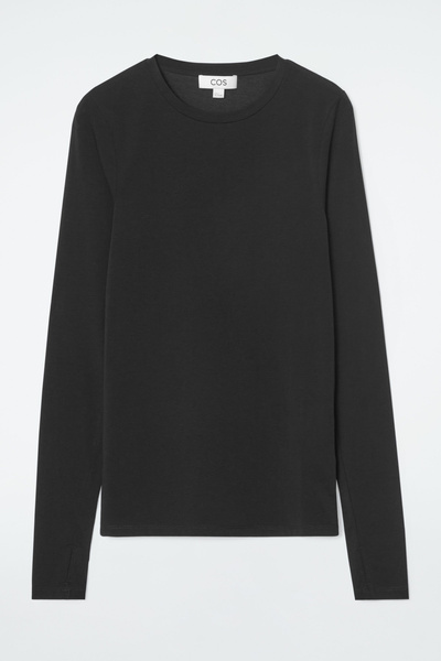 This long-sleeved top is designed as the ideal layering piece. Cut in a close-fitting shape, it’s crafted from lightweight, 120gsm soft cotton with a touch of stretch and offered in an enduring black hue. The thumbhole cuffs provide extra comfort on chillier days.