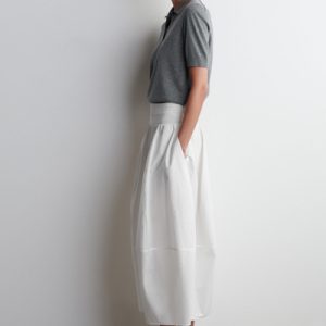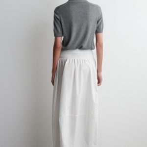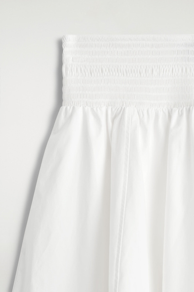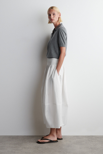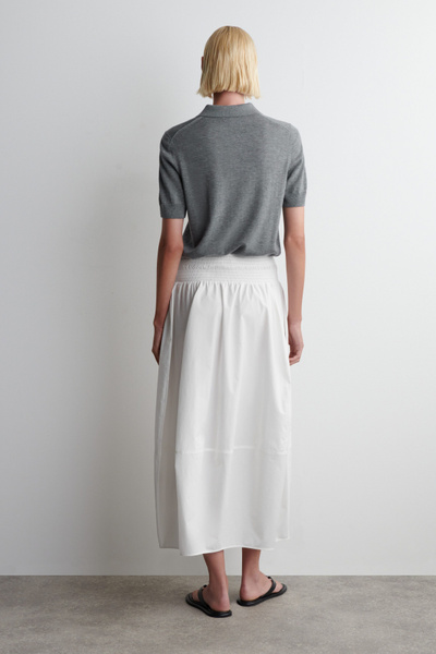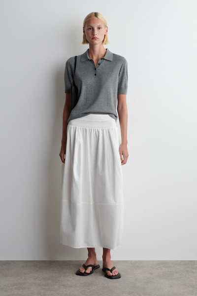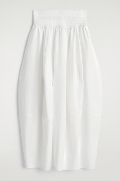 Channelling a modern elegance, this midi skirt is crafted from soft cotton and designed with a smocked waistband and a paneled, tulip-shaped skirt that moves with subtle volume. Style it with barely-there sandals and a bandeau for an effortlessly refined look.