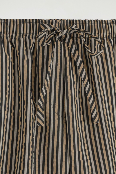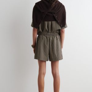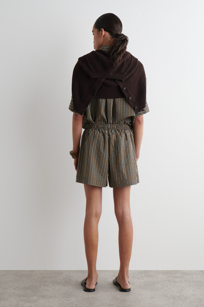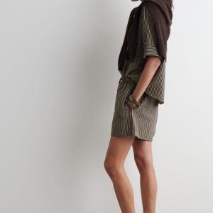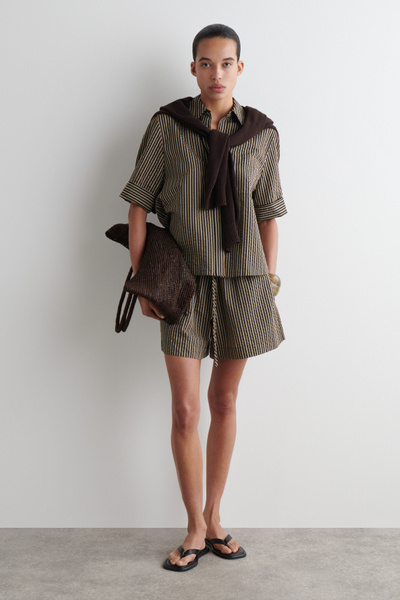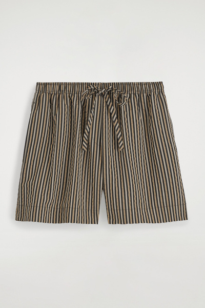 These drawstring shorts will ease your wardrobe into summer. They’re made from light, tactile seersucker and patterned with stripes in earthy brown, beige, and black tones. Style them as a set with the coordinating shirt.
