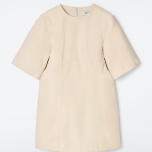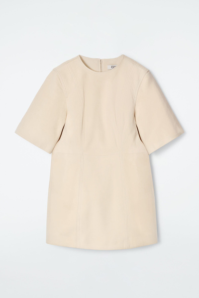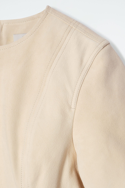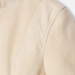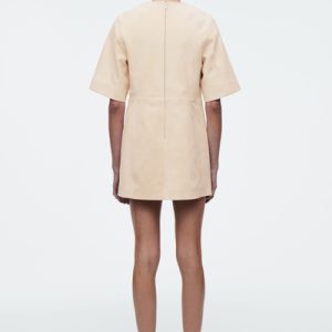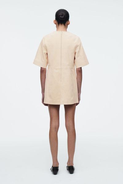 This season, the womenswear team present an elevated take on the T-shirt dress. Crafted from supple suede in a buttermilk hue, it features short sleeves, a zip closure and tonal topstitching that sculpts the silhouette.