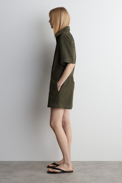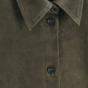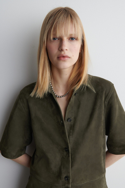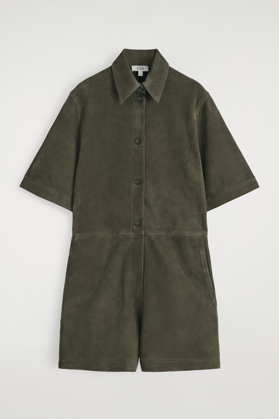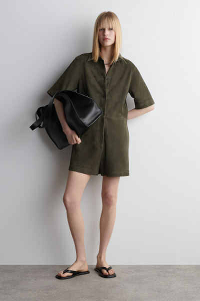 This refined romper blurs the lines between structure and softness. It’s crafted from richly textured suede in an earthy khaki tone and has a pared-back silhouette with a pointed collar, subtle buttons, and an elasticized waist at the back for ease. Style it with simple accessories to keep the supple hide in focus.
