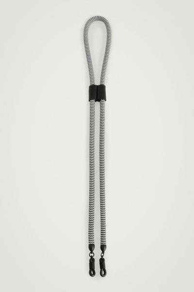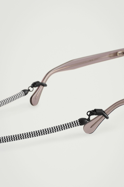Made from a woven cord, this striped strap fixes to your sunglasses so you can wear them around your neck on drawn-out days in the sun. The looped silicone ends safely grip your frames, while the leather keeper can be used to adjust the length.
