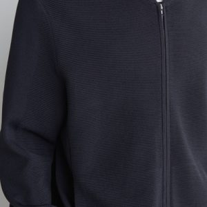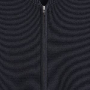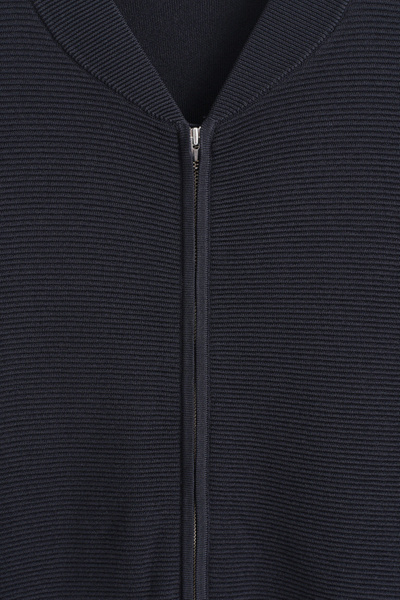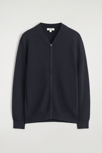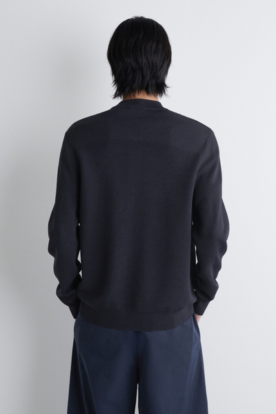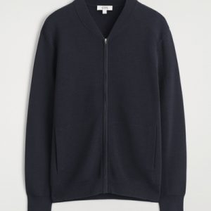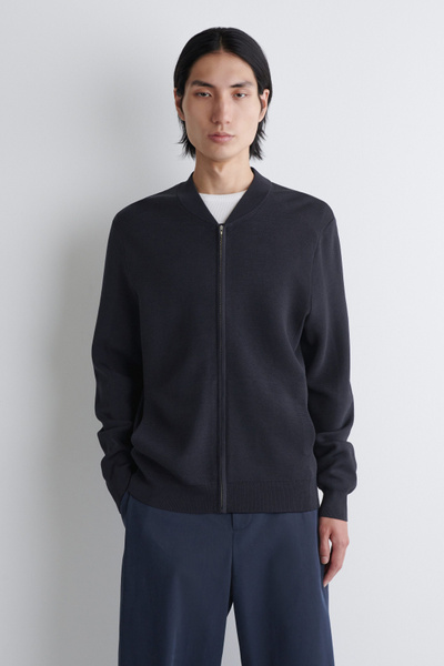 This season, the menswear team reimagines wardrobe signatures through richly textured fabrics. This modern bomber jacket is knitted using a technical stitch that contrasts with the clean shoulders and sleeves. It’s kept otherwise classic with a silver-tone zipper and ribbed collar, cuffs, and hem.