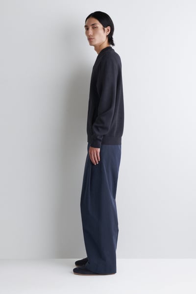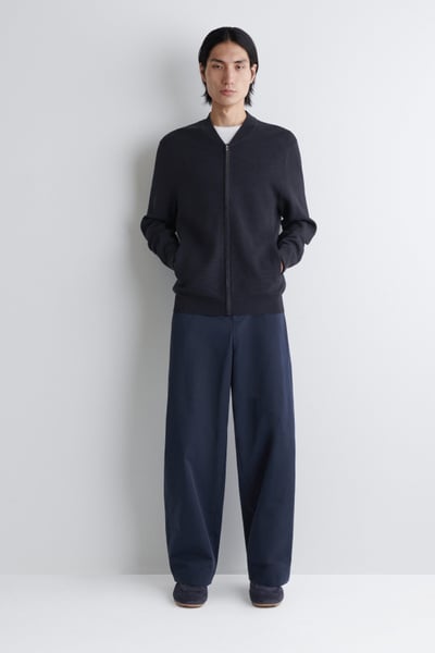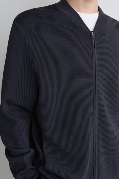 This season, the menswear team reimagines wardrobe signatures through richly textured fabrics. This modern bomber jacket is knitted using a technical stitch that contrasts with the clean shoulders and sleeves. It’s kept otherwise classic with a silver-tone zipper and ribbed collar, cuffs, and hem.