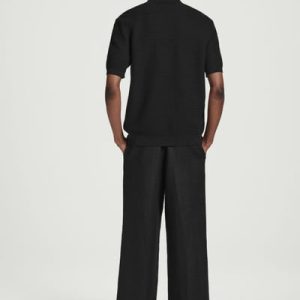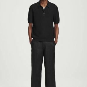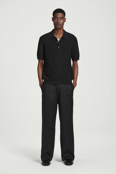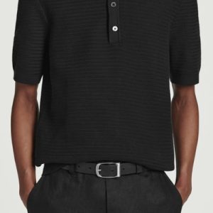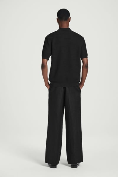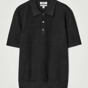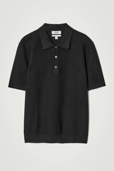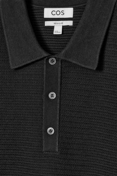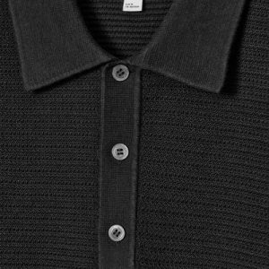 This modern polo shirt lends itself to laid-back looks yet is refined enough for smarter outings. Cut in a classic shape, it’s knitted from cotton in a textured stitch and features a ribbed collar, mother-of-pearl buttons and short sleeves. The enduring black hue styles well with denim or tailoring.