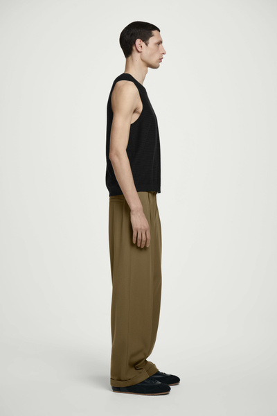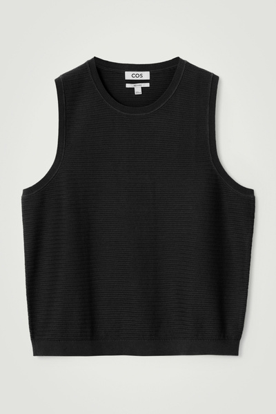 This season, the COS menswear team bring a textural upgrade to classic wardrobe essentials. This laid-back tank top is knitted from cotton using a micro cable-knit stitch and features a ribbed crew neck and tubular seams.
