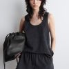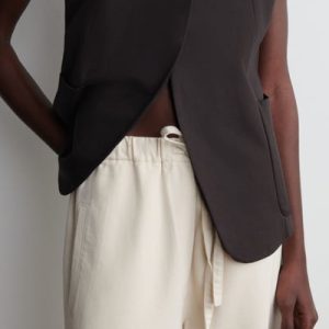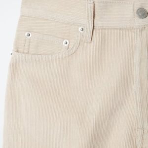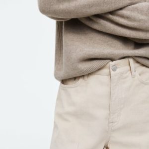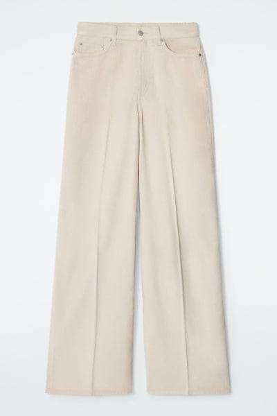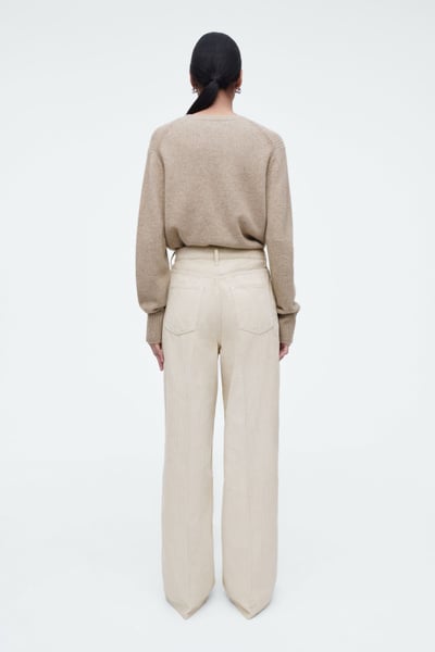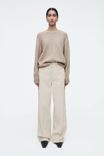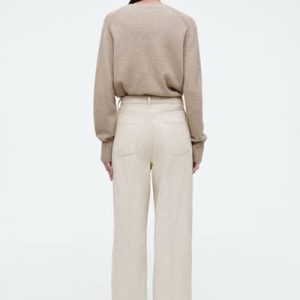 The Tide jeans are characterized by their high-waisted shape and wide, elongated legs. This season, they’re reimagined in ’70s-inspired cotton-corduroy and come in a timeless dusty-beige shade. The full-length hems pool to the floor and work just as well with heels as they do flats.
