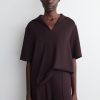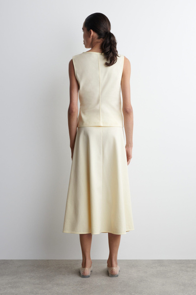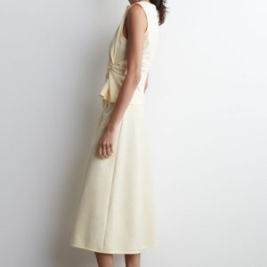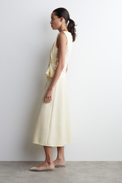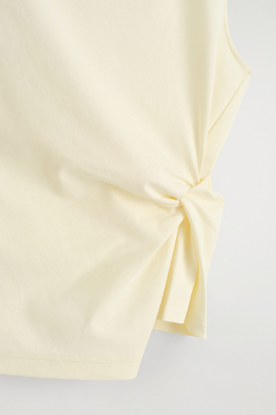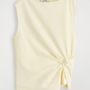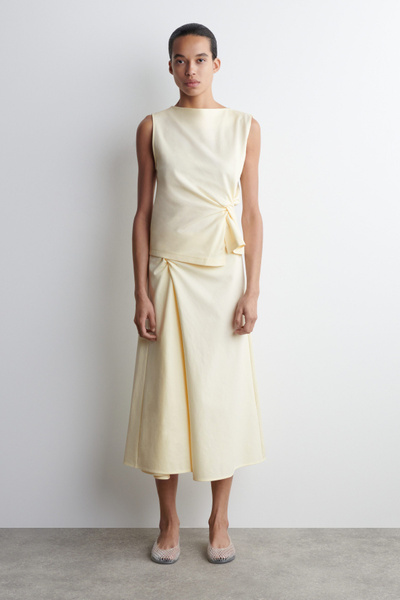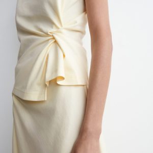 Asymmetric in shape, this top features a twisted detail that softly defines the waist. It’s designed with a rounded neckline and crafted from soft Pima cotton-blend jersey in a subdued butter-yellow tone. Style it with denim or as a set with the coordinating skirt.