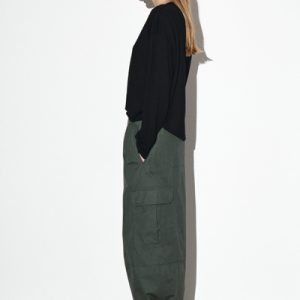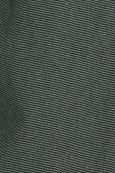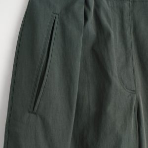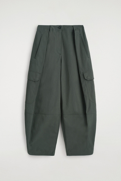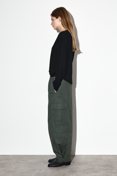 These pants are designed in a directional barrel-leg shape that adjusts at the ankle for a tailored fit. A nod to utility, they are crafted from a cotton-blend twill in a khaki color and feature pleats at the front and several practical pockets.