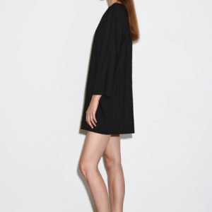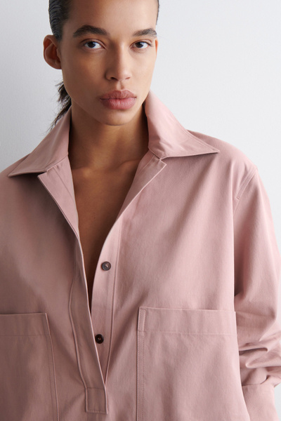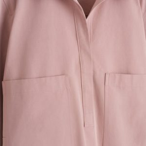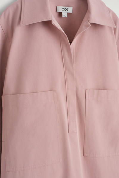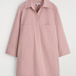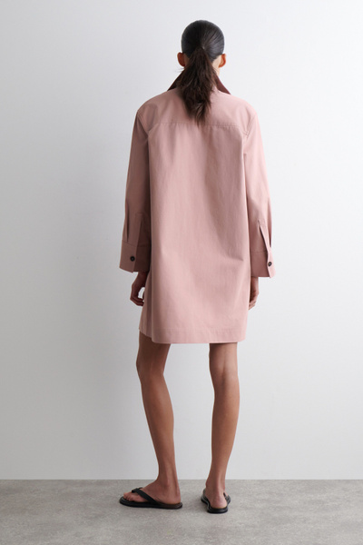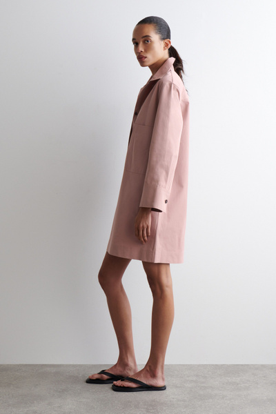 This modern mini shirt dress borrows from utility. Made from naturally lightweight cotton, it’s cut in a relaxed silhouette and features a pair of workwear-inspired patch pockets at the chest. It’s designed with slightly cropped sleeves, a pointed collar and a V-neckline.