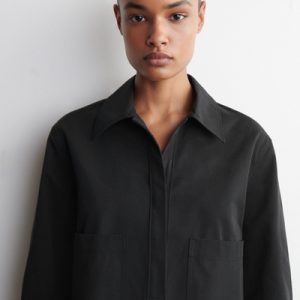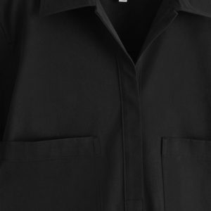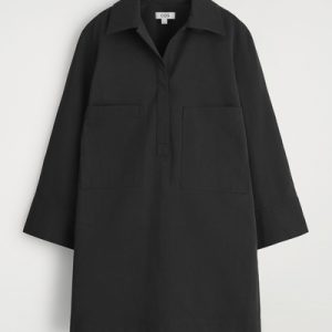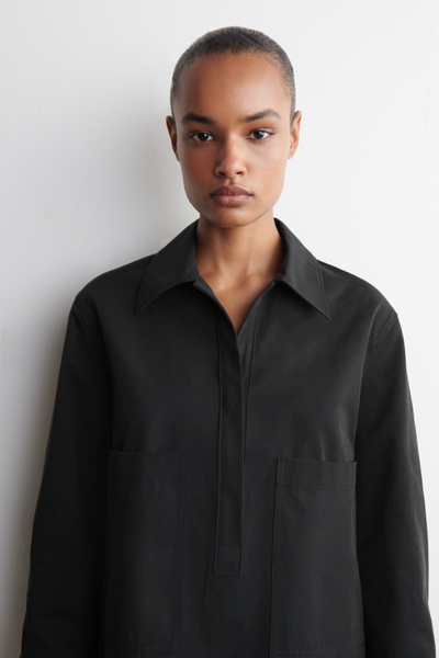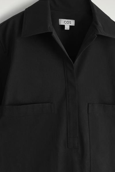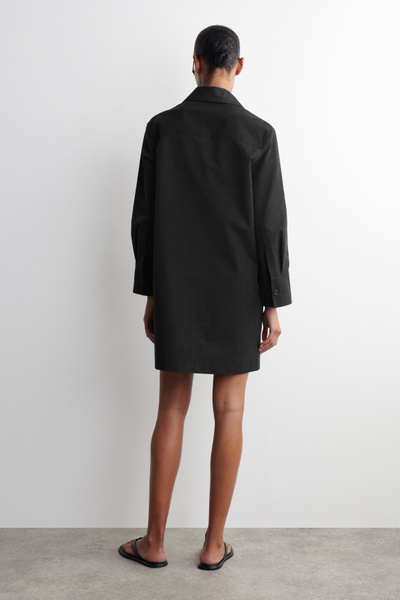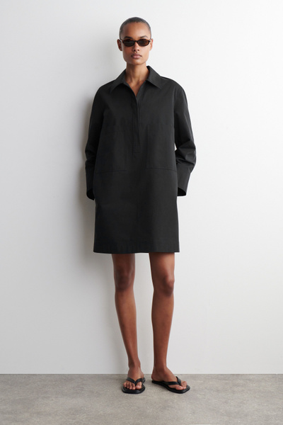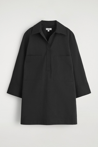 This modern mini shirt dress borrows from utility. Made from naturally lightweight cotton, it’s cut in a relaxed silhouette and features a pair of workwear-inspired patch pockets at the chest. It’s designed with slightly cropped sleeves, a pointed collar and a V-neckline.