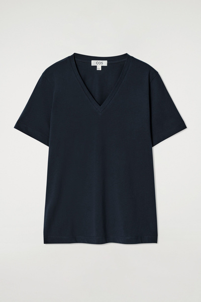 The COS womenswear team presents an everyday icon, perfected. This refined T-shirt is crafted from lightweight 150gsm cotton-jersey, chosen for its comfort and unparalleled softness. It’s cut in a classic V-neck shape and comes in an enduring navy tone.
