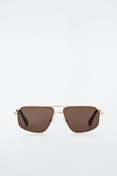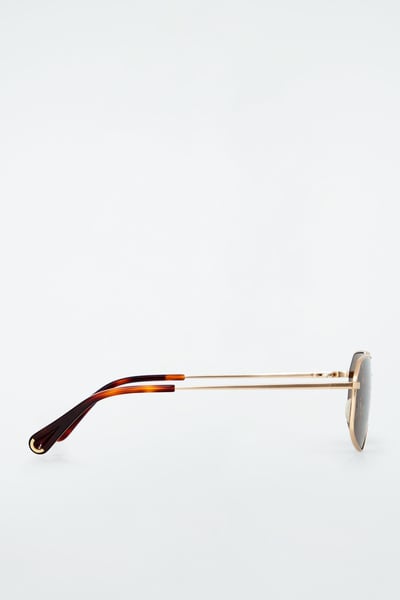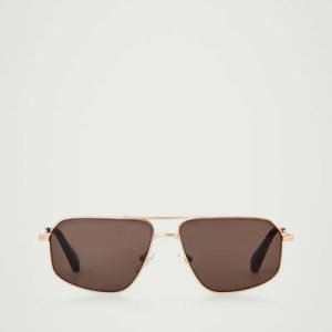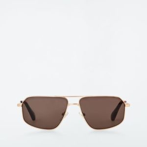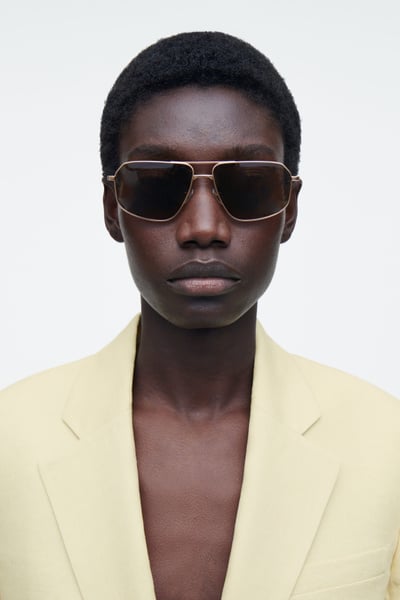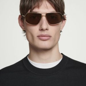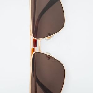 Introducing the LINDA FARROW spring summer 2025 collaboration: new expressions of nostalgic styles that embody a creative spirit – a meeting of timeless and contemporary. Sculpted in an angular shape, the Vista sunglasses have deep-brown tinted lenses that complement the gold tone of the wire frames and the tortoiseshell tips.