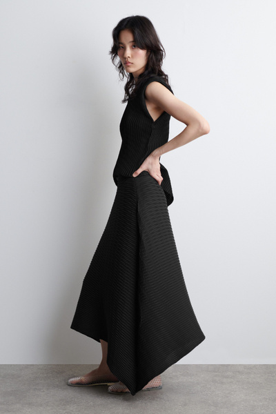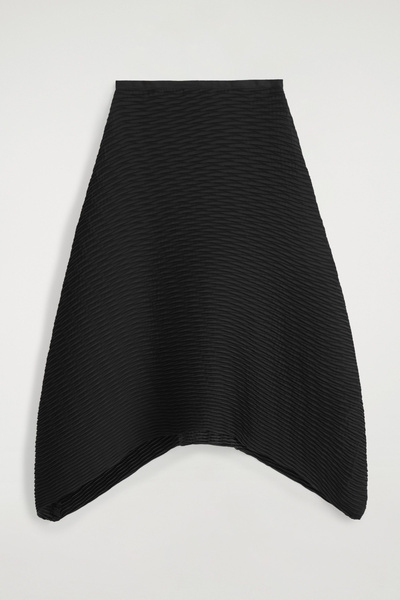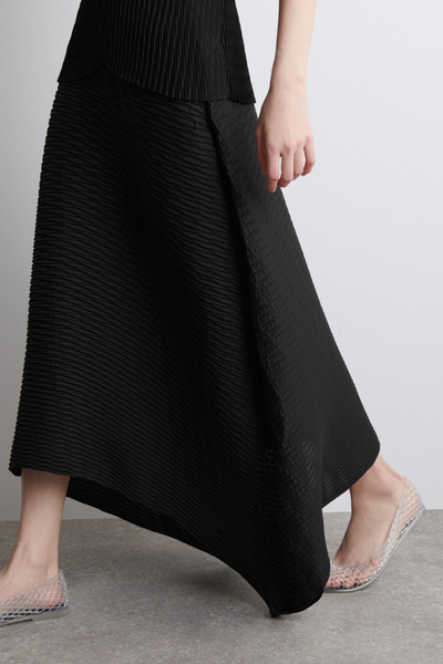 This striking midi skirt has a sculptural silhouette that falls with buoyant movement. It’s made from structured, springy fabric with all-over rippled folds that create surface interest, while the curved hem is carefully topstitched for a precise finish. Style it with thematching top.