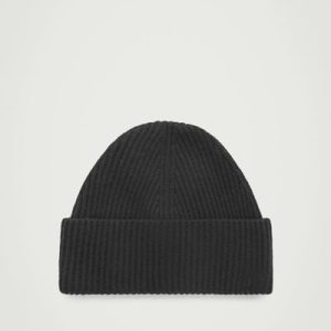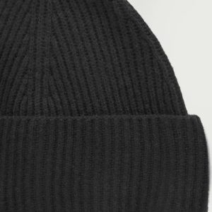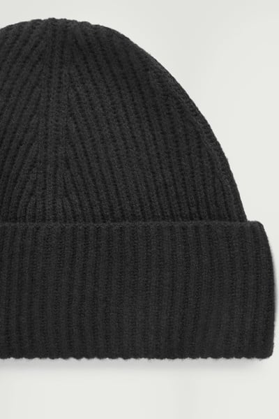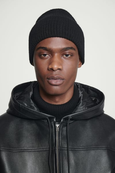 A cozy beanie is a staple of any winter wardrobe. This classic black one is knitted from 100% pure wool that is certified according to the Responsible Wool Standard and has an oversized fold and a ribbed construction to keep warmth in.