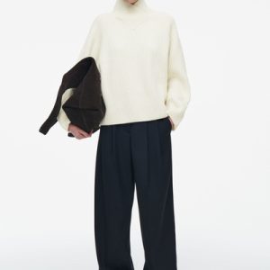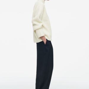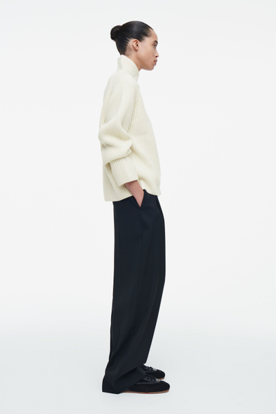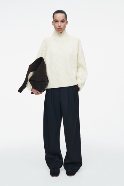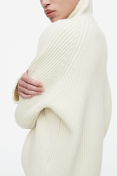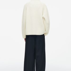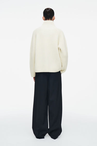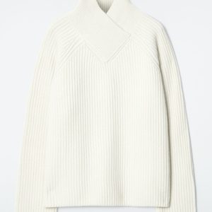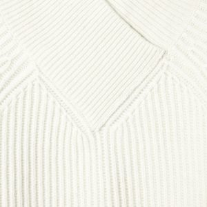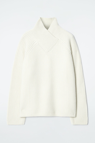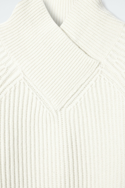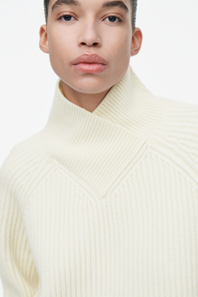 Designed with a distinctive wrap collar, this modern sweater is rib-knitted from premium merino wool and comes in a subdued ecru tone. Tuck your hair into the collar for undone appeal.