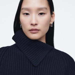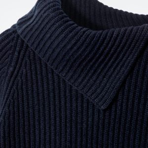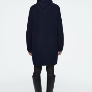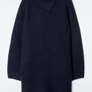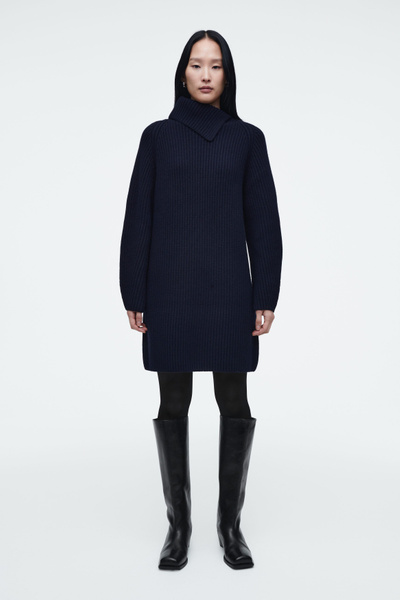 Designed with a distinctive wrap collar, this modern dress is rib-knitted from premium RWS wool and comes in a subdued navy tone. Tuck your hair into the collar for undone appeal.
