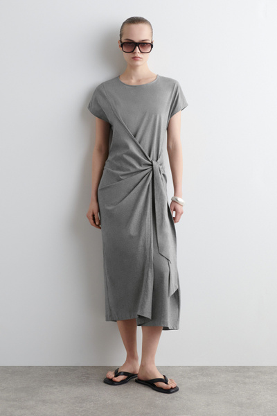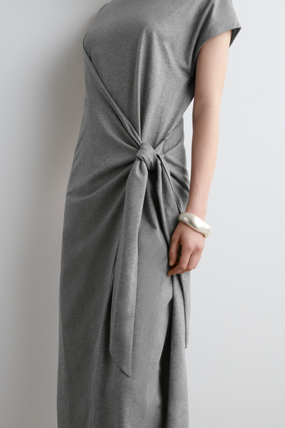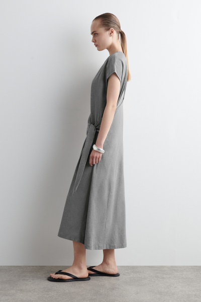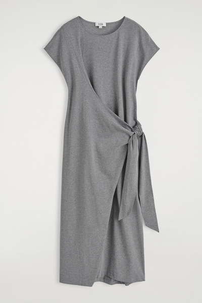 This season, the COS womenswear team presents a modernized take on the T-shirt dress. Offered in a subdued gray tone, it’s crafted from soft cotton-jersey and features a wrap detail that ties effortlessly at the hip. Style it with heeled mules for a refined sensibility.